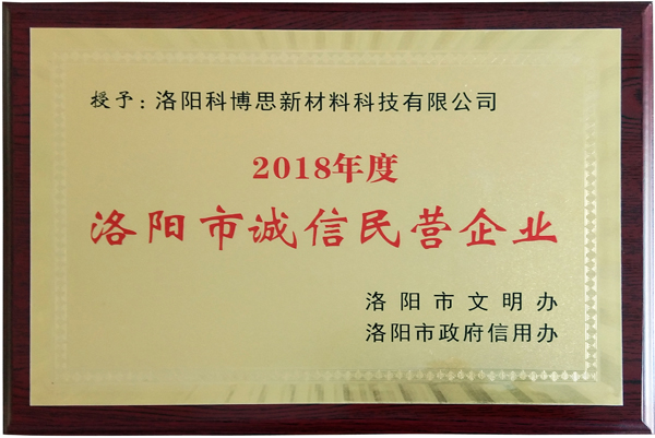 近日,由市文明辦與市政府信用辦舉辦的《洛陽市2018年度“誠信經(jīng)營企業(yè)”和“誠信建設(shè)先進(jìn)個人”評選活動》,經(jīng)推薦遴選和嚴(yán)格評審,洛陽科博思新材料科技有限公司被授予“誠信民營企業(yè)”榮譽(yù)稱號。