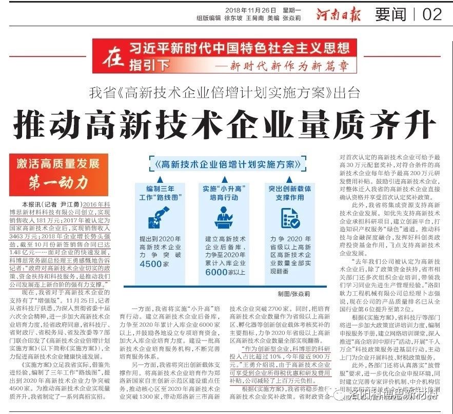 官宣:推動(dòng)高新技術(shù)企業(yè)量質(zhì)齊升——洛陽科博思新材料科技有限公司接受《河南日?qǐng)?bào)》專訪